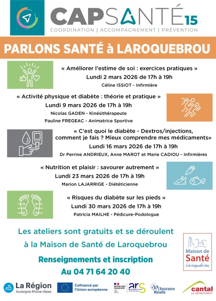 La Maison de Santé de Laroquebrou accueille, tout au long du mois de mars 2026, une série d’ateliers gratuits et ouverts à tous autour du diabète, dans le cadre de l’initiative « Parlons Santé » portée par CAP Santé 15.